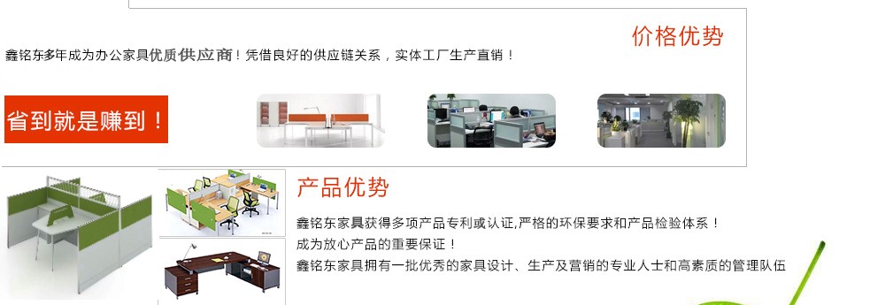 深圳市鑫銘東家具有限公司深圳市鑫銘東家具有限公司專(zhuān)業(yè)銷(xiāo)售各類(lèi)辦公家具!產(chǎn)品涉及多種系列,如:班臺(tái)、班椅、屏風(fēng)、會(huì)議桌、會(huì)議椅、辦公沙發(fā)、茶幾、辦公桌、文件柜、電腦桌椅、各式餐臺(tái)、餐椅、書(shū)柜等辦公家具。 鑫銘東家具擁有一批優(yōu)秀的家具設(shè)計(jì)、生產(chǎn)及營(yíng)銷(xiāo)的專(zhuān)業(yè)人士和高素質(zhì)的管理隊(duì)伍。銘東家具以"先難后易"之戰(zhàn)略,在產(chǎn)品結(jié)構(gòu)、產(chǎn)品質(zhì)量及服務(wù)水平方面,均推陳出新,力求完善,精益求精。使我們的產(chǎn)品質(zhì)量保持在國(guó)內(nèi)外家具潮流的先進(jìn)水平,力求滿(mǎn)足客戶(hù)的特殊需求。鑫銘東家具多年來(lái)致力于環(huán)保、實(shí)用家具的設(shè)計(jì)與開(kāi)發(fā),集生產(chǎn)、銷(xiāo)售、服務(wù)于一體。本著"以人為本"的設(shè)計(jì)理念,大量開(kāi)發(fā)符合人體工程學(xué)的各種產(chǎn)品,以"誠(chéng)信為本"的質(zhì)量方針,真材實(shí)料,認(rèn)認(rèn)真真做產(chǎn)品,實(shí)實(shí)在在做人。鑫銘東家具更致力于創(chuàng)造"零維修率"的制造境界,實(shí)現(xiàn)"沒(méi)有維修的服務(wù)才是最好服務(wù)"的口號(hào)》了解更多 |